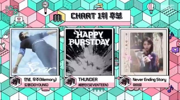 이날 공개된 1위 후보에는 NCT 도영 '안녕, 우주(Memory)', 세븐틴 'THUNDER', 아이유 'Never Ending Story'가 나란히 이름을 올렸다.
