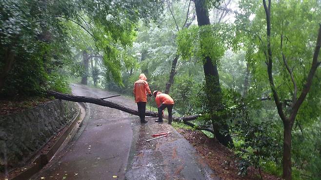 폭우와 강풍으로 인해 나무 쓰러짐 28건과 함께 신호기 고장 4건, 도로 침수 4건 등이 발생했습니다.
