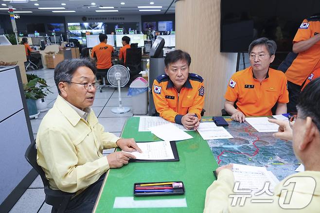 (광주=뉴스1) 박준배 기자 = 강기정 광주시장이 21일 오전 시청 광주소방안전본부 119종합상황실을 찾아 호우 대처 상황을 점검하고 시민안전을 위해 최선을 다 해 주길 당부하고 있다. (광주시 제공. 재판매 및 DB 금지) 2025.6.21/뉴스1