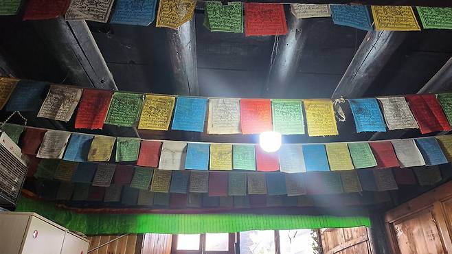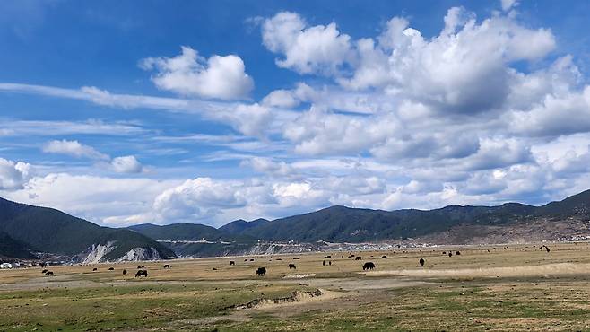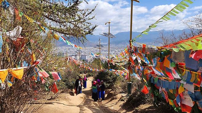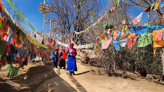 진분홍 머리장식을 두른 소수민족 할머니들, 슬렁슬렁 거리를 지나가는 야크들, 그리고 화려한 티베트 불교 장식이 어우러진 소담한 건물들. 바람이 불 때마다 오색 천 깃발, 타르쵸가 펄럭이며 축복을 퍼뜨린다는 믿음까지, 눈길 닿는 모든 곳에 이곳만의 고요한 리듬이 흐르고 있었다.