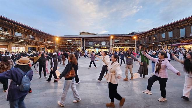 식사를 마치려던 찰나, 샹그릴라 구시가지 중심에 위치한 시방제(十邦街) 광장에서 흥겨운 음악 소리가 들려왔다. 창문 너머를 내다보니 수많은 사람들이 둥글게 원을 그리며 춤을 추고 있었다. 호기심이 동한 우리는 남은 야크 고기를 급히 입에 넣고 시방제로 달려나갔다.