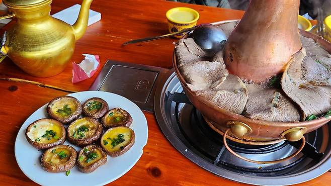 | ▲ 중국 윈난 샹그릴라의 전통 식당 표고버섯 요리와 야크 고기 샤브샤브 |