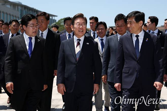 | ▲ 이재명 대통령이 4일 서울 여의도 국회 로텐더홀에서 취임 선서를 마친 뒤 우원식 국회의장 및 여야 6당 대표와 오찬을 위해 사랑재로 이동하며 박찬대(왼쪽) 더불어민주당 대표 직무대행과 김민기 국회 사무총장과 대화하고 있다. |