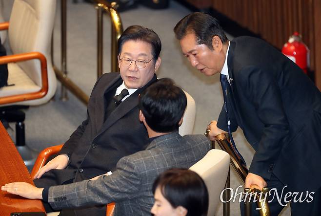 | ▲ 이재명 더불어민주당 대표가 3일 오후 국회 본회의에서 정청래, 김민석 의원과 대화하고 있다. |