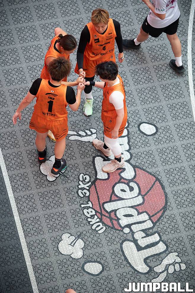 [점프볼=고양/유용우 기자] 21일 스타필드 고양 1층 센트럴 아트리움 특설 코트에서 열린 ‘2025 하나은행 WKBL 3x3 트리플잼’ 2차 대회, 일본 플로리시 군마 선수들이 화이팅을 외치고 있다.