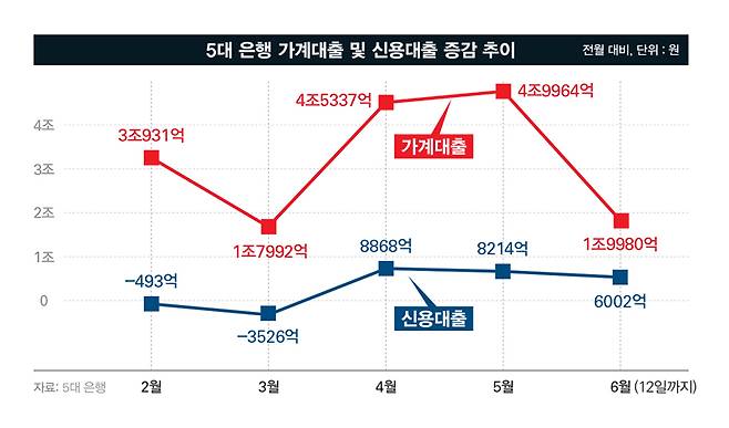 KB국민·신한·하나·우리·NH농협 등 5대 시중은행의 가계대출 잔액은 6월12일 기준 750조791억원으로, 5월말 대비 1조9979억원 늘어났다. 이 추세라면 6월 가계대출 증가 규모는 5조원을 넘을 전망이다. 5대 은행의 가계대출은 지난 4월(4조5337억원)과 5월(4조9964억원) 연이어 4조원 이상 불어났다. 주택담보대출이 같은 기간 1조4799억원 늘어난 결과다. 한동안 보합세를 보였던 집값이 최근 서울을 중심으로 오름세를 보이면서 대출 수요가 급증했다는 것이 주된 해석이다. 더불어 한국은행이 기준금리 인하를 시사해 집값 상승에 대한 기대감이 커진 점도 대출 증가의 원인으로 꼽힌다.
