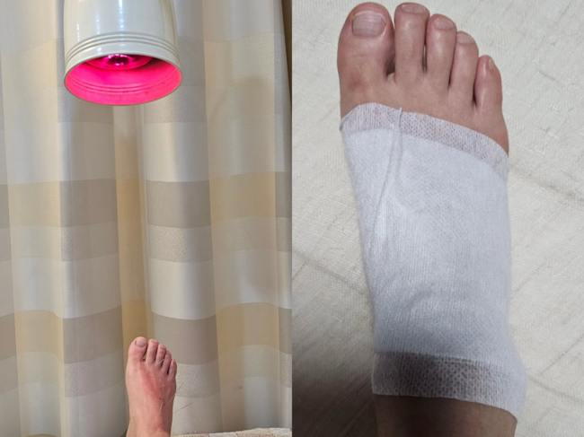 이어 "사람이 안 하던짓을 하면 안 된다. 생전 안 들어가는 열탕에서 족욕을 하고 나오다 미끄러졌다. 열탕 부분은 문을 밀고 당기는 부분이라 깔판이 안 깔려 있어서 물기가 있으면 미끄러지기 쉬운데 방심했다. 발등이 부어오르고 점점 걷는게 절룩거리고 힘이 가해지면 아퍼서 샤워만 하고 빨리 한의원 왔다는.."이라고 털어놨다.