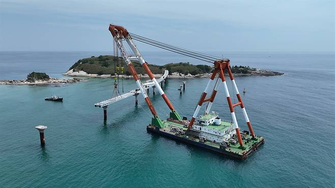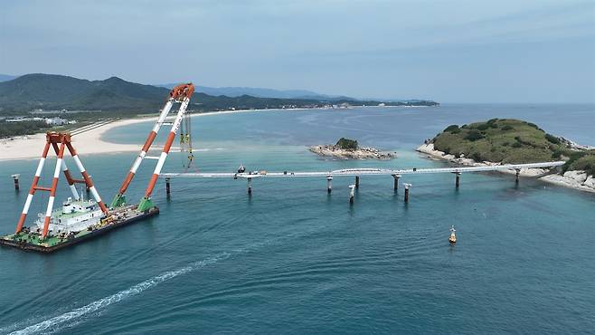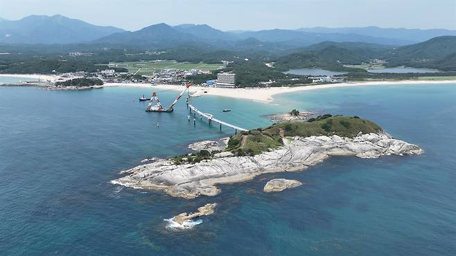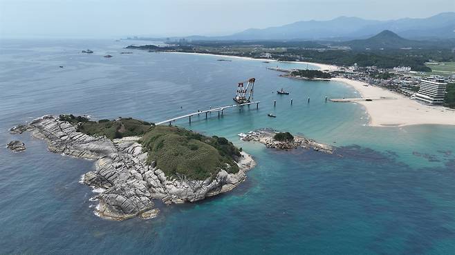 | ▲ 죽도해상공사 죽도와 송지호 해변을 잇는 길이 780m의 해상길과 해상전망대, 해중공원을 조성하기 위한 공사가 진행 중(2025/6/16) |