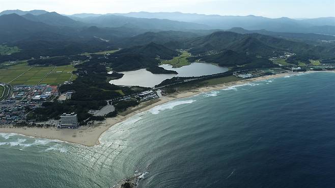 | ▲ 죽도 상공에서 바라본 송지호와 해변 석호인,송지호와 해변,백두대간이 한눈에 들어온다. |