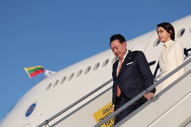 | ▲ 지난 2023년 7월 10일 오후(현지시간) 북대서양조약기구(NATO·나토) 정상회의에 참석하는 윤석열 대통령과 김건희 여사가 리투아니아 빌뉴스 국제공항에 도착, 전용기인 공군 1호기에서 내리고 있다. |