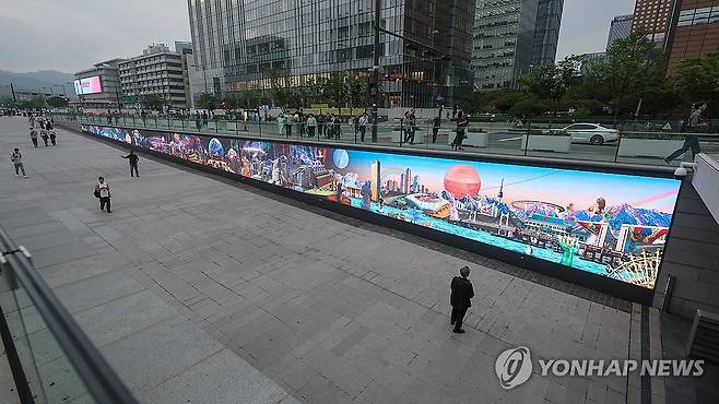 (서울=연합뉴스) 서대연 기자 = 21일 저녁 서울 종로구 광화문광장 해치마당 미디어월에서 미디어아트가 펼쳐지고 있다.