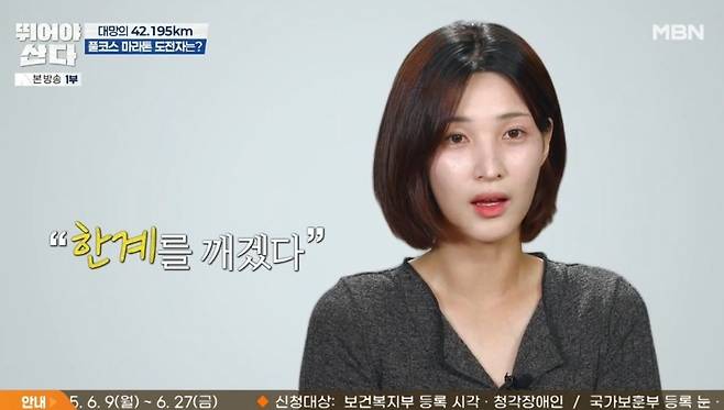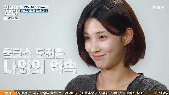 이어 율희, 손정은, 양소영도 등장했다. 양소영은 "벽을 넘어볼 수 있는 경험이 쉽지 않은데, 같이하면 할 수 있을 것 같다"라고 했고, 손정은은 "풀코스 완주가 목표였다. 인생 버킷리스트 같은 거였다"라고 기대했다. 율희는 "혼자 마음속으로 다짐했던 약속들 있지 않냐. '한계를 깨겠다' 같은"이라며 "풀코스 마라톤을 나가지 않으면 완성되지 않는 저와의 약속들이라 도전하게 됐다"라고 포부를 밝혔다.