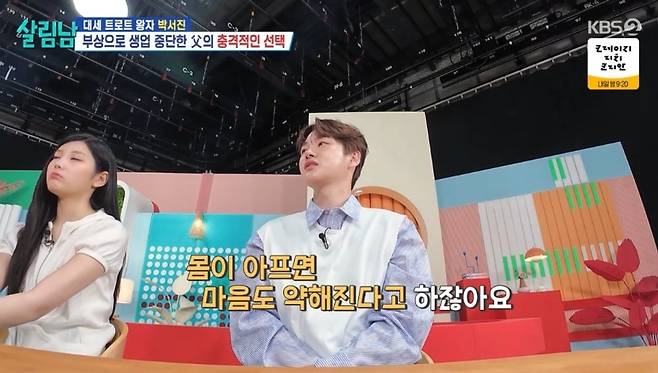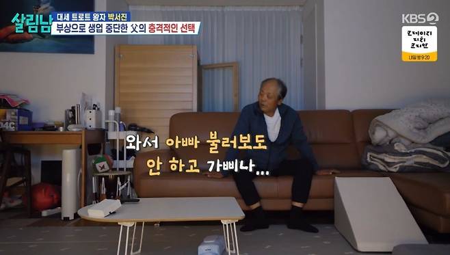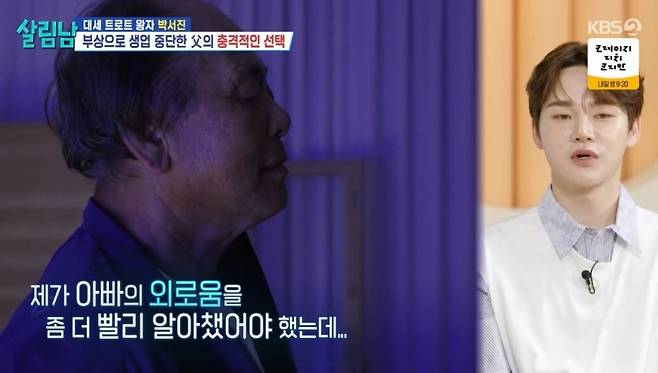 이날 배에서 넘어져서 다친 박서진 아버지는 "팔이 아파서 요즘 뱃일도 못 한다"라고 토로했고, 박서진은 "팔은 괜찮아졌는데 무릎이 안 좋아졌다. 회복도 더뎌져서 걱정이다"라고 전했다.