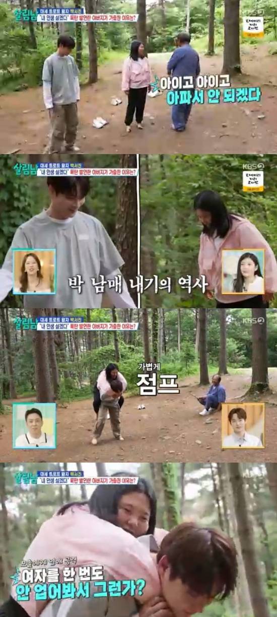 박서진이 여동생을 업어주다가 실리콘 걱정을 했다.