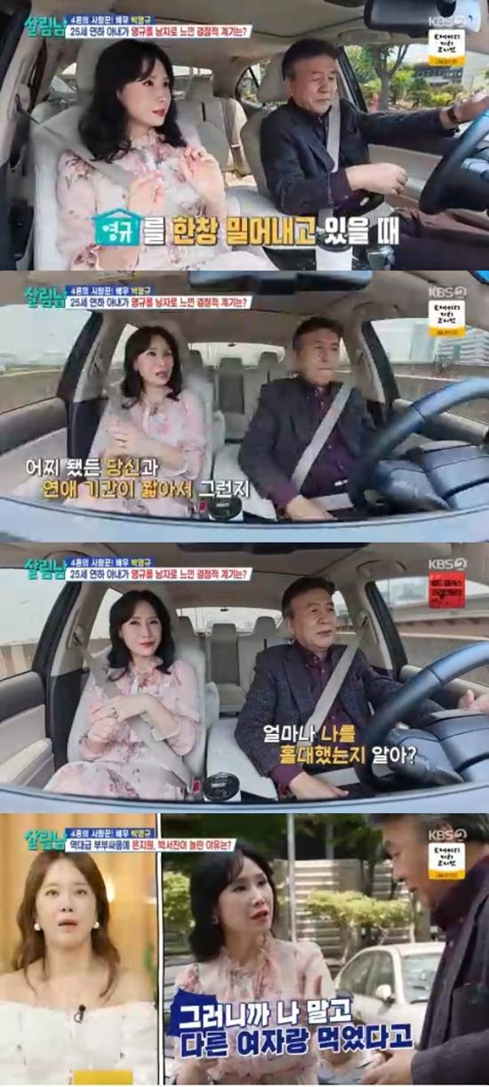 박영규는 연애시절을 얘기하며 행복해하는 이윤주를 향해 "난 무지하게 속 썩었다. 당신이 얼마나 나를 홀대했는지"라고 아내가 자신을 밀어냈을 당시를 떠올렸다.