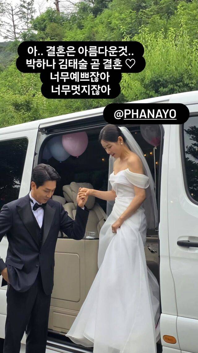 배우 문지인은 "아 결혼은 아름다운 것. 박하나 김태술 곧 결혼♡ 너무 예쁘잖아. 너무 멋지잖아"라며 드레스를 입고 차에서 내리는 박하나와 그녀를 에스코트 하는 김태술을 모습을 담은 사진을 공개했다. 이후 "비주얼 부부♡"라며 야외 결혼식장에 입장하는 두 사람을 공개했다.