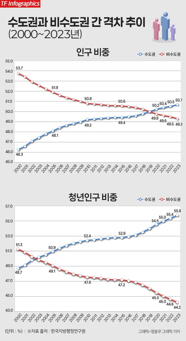 우리나라는 '수도권 공화국'이라고 해도 과언이 아니다. 통계상 국민 두 명 중 한 명은 수도권에서 살고 있기 때문이다. 통계청이 3월에 발표한 '2024 한국의 사회지표'에 따르면 지난해 총인구 5175만명 가운데 수도권(서울·경기·인천)의 인구가 2630만명이다. 전체 인구의 50.8% 규모다. 수도권 인구 비중이 2019년 처음으로 50%를 기록한 이후 매년(50.2%→50.4%→50.5%→50.7%) 증가하고 있다. 특히 청년들의 지방 전출이 느는 추세다.