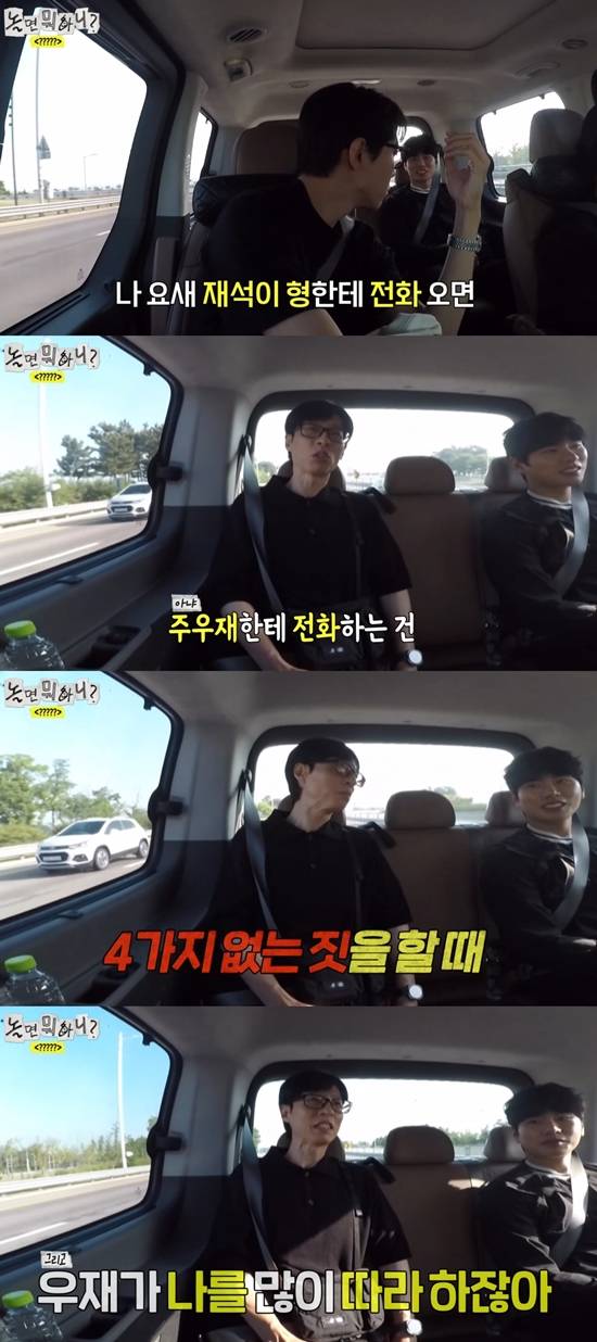 주우재는 "나 요새 재석이 형 가끔 전화 오시면 움찔한다. 혹시 지난주에 내가 뭐 했나 (싶어서)"라고 말했다. 유재석은 "(내가) 주우재한테 주로 전화하는 건, 싸가지 없는 짓을 많이 했을 때다"라고 밝혔다.