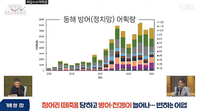 ◇ 윤신영> 바다 수산물 좋아하시는 분들은 이미 체감하고 계시는 부분이 있을 것 같아요. 난류성 어종들이 많이 늘고 있다는 분석이 나오고 있는데요. 대표적인 게 방어, 전갱이, 삼치 같은 것들이 늘고 있다고 해요. 단순히 추정이나 경험적인 게 아니고요. 꽤 데이터들이 쌓여서 국립수산과학원에서도 발표하고 있는데, 2015년 이후로 급격히 증가한 것들이 전갱이와 방어입니다. 어획량 수치가 2015년 이후 2020년 전후로 굉장히 급격히, 전과는 비교할 수 없을 정도로 급격히 늘어 있는 상태고요. 예를 들어서 예전에는 강원도 가장 최북단, 고성 같은 데서는 볼 수 없었던 방어가 지금은 거기서도 잡히고 있다고 해요.
