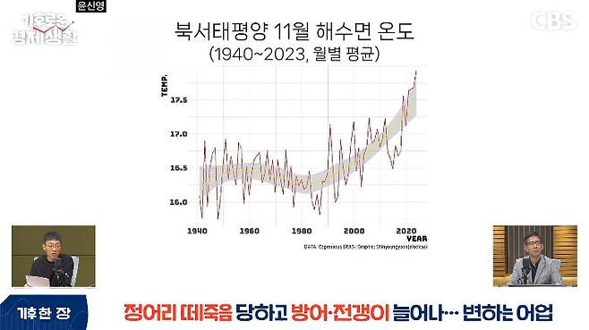◆ 홍종호> 저는 기자님이 1940년부터 그래프를 그리는 게 아주 의미가 크다고 생각하는 게, 1950년 특히 넘고부터는 이산화탄소 배출량이 급증합니다. 전후 급격한 경제 성장과 더불어서 화석연료 사용이 급증하거든요. 탄소 배출량도 그때 급증하고, 그런 것이 바다의 급격한 온도 상승과 무관치 않다는 생각하게 되네요.