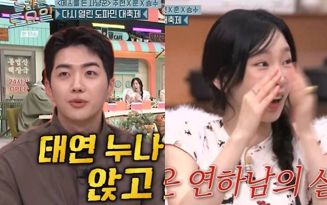태연은 강훈에게 "옆에 앉고 싶다고 말씀하신 거냐"라고 물었고, 강훈은 "네네. 제가"라고 답해 설렘을 자아냈다.