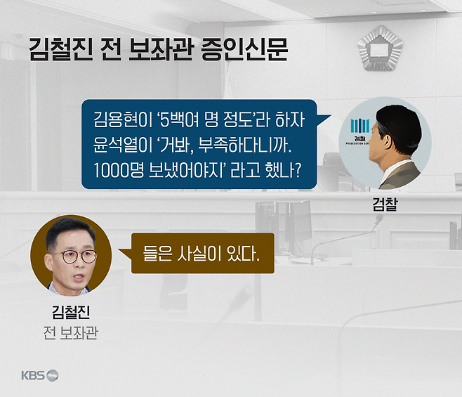 윤 전 대통령이 '국회에 몇 명이나 투입했냐'고 물었고, 김 전 장관이 '5백여 명 정도'라고 답하자, 윤 전 대통령이 '거봐, 부족하다니까. 천 명 보냈어야지. 이제 어떡할 거야'라고 말했다는 게 김 전 보좌관 증언입니다.