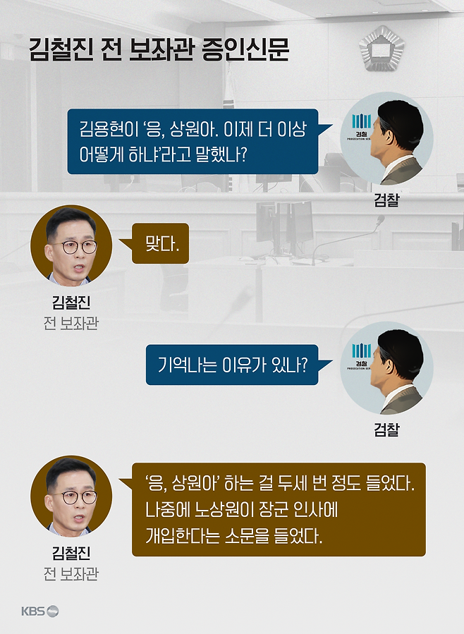 김 전 보좌관은 "통상 장군 인사가 있고 나면 이번 인사가 어땠는지 보좌관실에서 간단한 분위기를 파악해 보고를 드린다"며 "일부 인원이 노상원 장군에 의해 인사가 이루어졌다는 거북한 이야기를 했다"고 말했습니다.