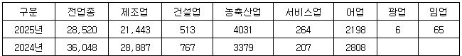 어업 또한 2천808명에서 2천198명으로 21.7%, 건설업은 767명에서 513명으로 33.1% 감소했다.