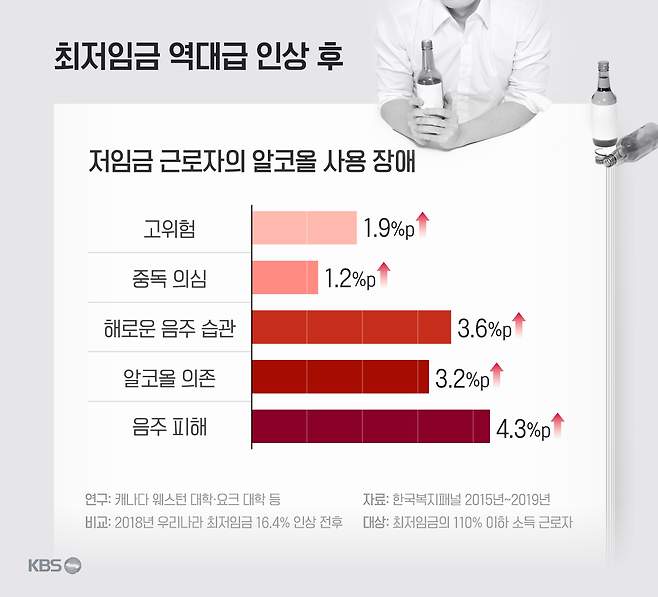 그 결과, 최저임금 이하로 받는 근로자는 인상 후 '알코올 중독 의심' 비율이 1%p 증가한 것으로 조사됐습니다. '해로운 음주 습관' 비율도 4.2%p 상승했습니다.