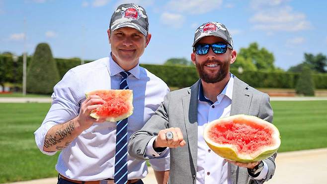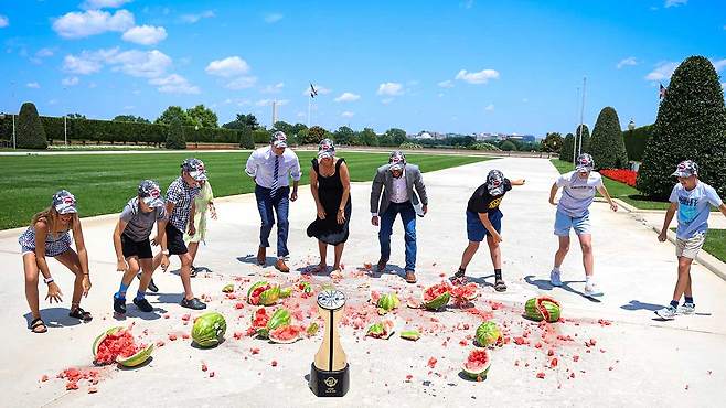 챔피언 채스테인의 가족은 수박 농장을 운영하고 있고, 그는 경기에서 승리할 때마다 수박을 깨트리는 퍼포먼스로 유명합니다. 영상의 하이라이트는 헤그세스 본인이 ‘수박 깨기’에 동참하는 것이었습니다. 헤그세스의 아내와 아이들 그리고 채스테인의 가족은 하나씩 수박을 머리 위로 높이 들어올렸습니다. 채스테인의 카운트다운에 맞춰 힘차게 수박을 바닥에 던지자 펜타곤 도로에 빨간 수박 속살이 나뒹굴었습니다.