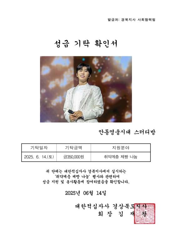 '영웅시대 안동스터디방'은 "평소 나눔과 선행을 실천하는 임영웅의 선한 영향력에 동참하고자 했다"라며, "부족한 나눔이지만 우리 이웃들이 외롭고 지칠 때 위로가 되길 바란다"라고 전했다.