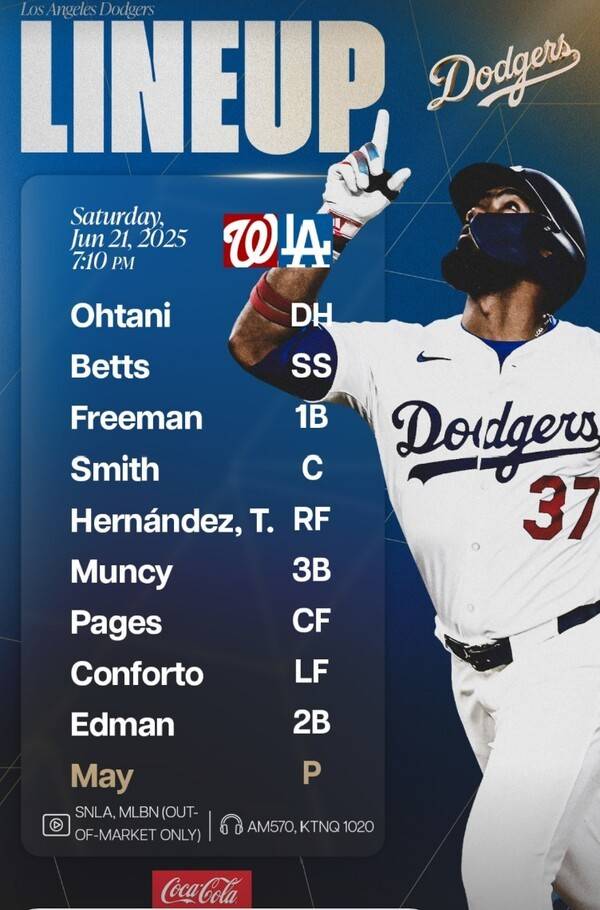 이날 다저스는 오타니 쇼헤이(지명타자)-무키 베츠(유격수)-프레디 프리먼(1루수)-윌 스미스(포수)-테오스카 에르난데스(우익수)-맥스 먼시(3루수)-앤디 파헤스(중견수)-마이클 콘포토(좌익수)-토미 에드먼(2루수)으로 라인업을 꾸렸다.