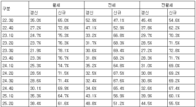 분기별 전월세 갱신·신규 계약 비중