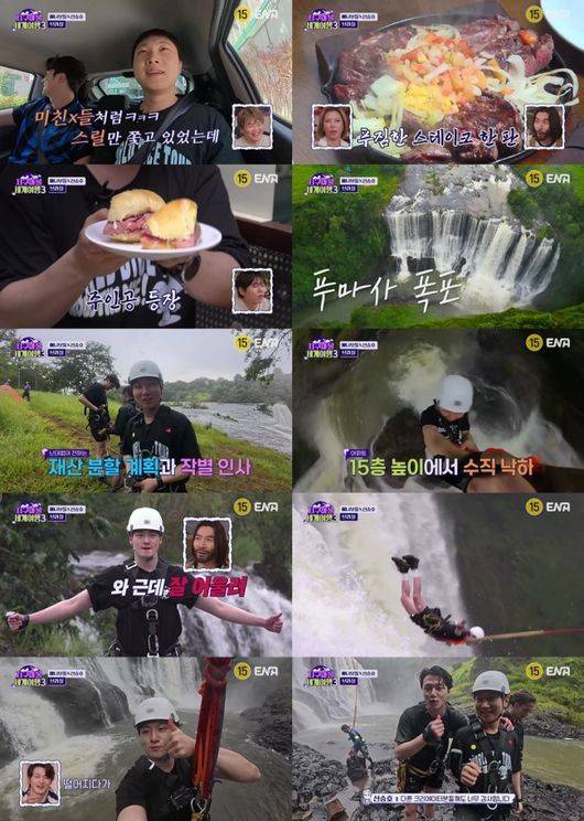 지난 21일 오후에 방송된 ENA ‘지구마불 세계여행3’(이하 ‘지구마불3’) 14회에서는 브라질의 ‘미친자들’ 빠니보틀과 신승호, 볼리비아의 ‘원지브리’ 원지와 파브리, 칠레의 ‘가비랑 의리랑’ 곽튜브와 가비가 대망의 5라운드 두 번째 여행기를 이어갔다. 각 팀은 극강의 스릴, 현지 폭풍 미식과 쇼핑, 그리고 대자연의 경이로움까지, ‘여행 콘텐츠 끝판왕’을 선보여 시청자들에게 짜릿한 대리만족을 선사했다. 특히 빠니보틀과 신승호가 아파트 15층 높이, 낙차 45m의 물줄기가 쏟아지는 푸마사 폭포에서 ‘자이언트 폭포 스윙’을 도전하는 장면은 시청률 분당 최고의 1분을 차지했다.