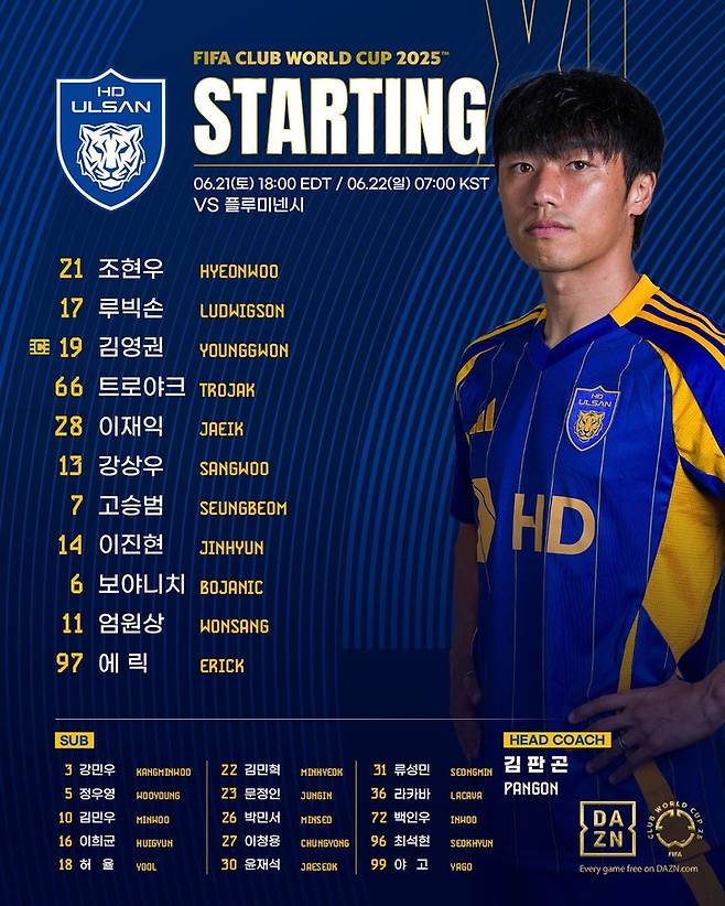 울산은 22일 오전 7시(이하 한국시간) 미국 뉴저지의 메트라이프 스타디움에서 열린 2025 국제축구연맹(FIFA) 클럽 월드컵 조별리그 F조 2차전에서 플루미넨시(브라질)에 2-4로 졌다.