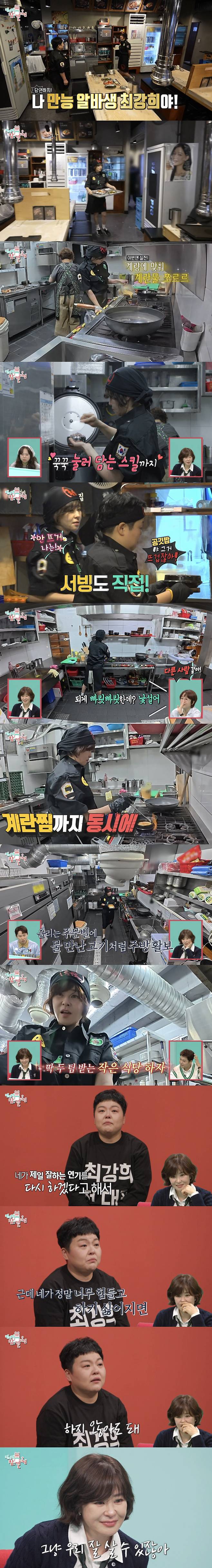 최강희는 "알바 당시 식당에서 설거지만 내 일이었고, 사이드 메뉴도 만들었다. 5시에 왔다가 10시에 퇴근했다"며 당시를 떠올렸다. 그는 "그땐 화곡동 엄마 집에 살았다. 화곡동에서 전철 갈아타고 논현동으로 가서 헬스를 2시간 하고 다시 전철을 2번 갈아타고 인천 고깃집에서 설거지 하고 10시에 퇴근해서 집에 와서 잤다"며 "그렇게 계속했다"고 말했다.