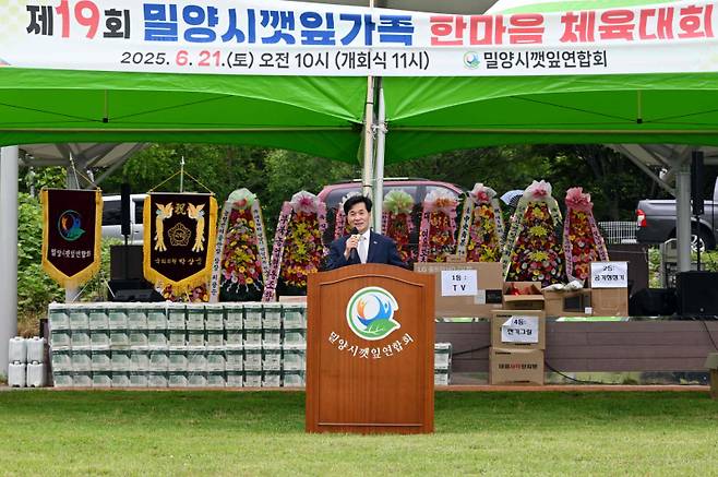 밀양시 깻잎연합회(회장 손한민)는 21일 산외면 체육공원에서 깻잎 재배 농업인들의 친목을 도모하고 농업정보 교류를 위한 ‘제19회 밀양시 깻잎 가족 한마음 체육대회’를 성황리에 개최했다.