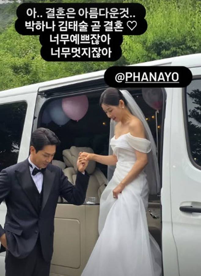 사진에는 턱시도를 입은 김태술과 신랑의 손을 잡고 차에서 내리는 박하나의 모습이 담겼다. 박하나는 순백의 오프숄더 드레스를 입고 단아한 자태를 뽐내며 감탄을 자아낸다.