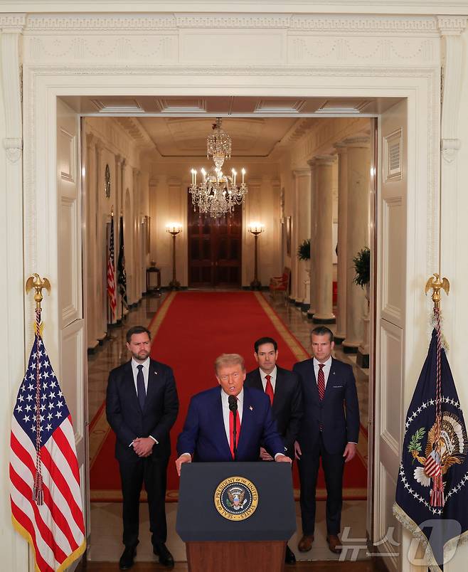 (워싱턴 로이터=뉴스1) 최종일 선임기자 = 도널드 트럼프 미국 대통령이 21일(현지시간) 미 워싱턴D.C 백악관에서 이란 핵시설에 대한 미군의 공격 작전과 관련해 대국민 연설을 하고 있다. 뒤쪽 왼쪽에 JD 펜스 부통령(왼쪽 첫번째), 마코 루비오 국무장관(오른쪽 두번째), 피트 헤그세스 국방장관이 서있다. 2025.06.21