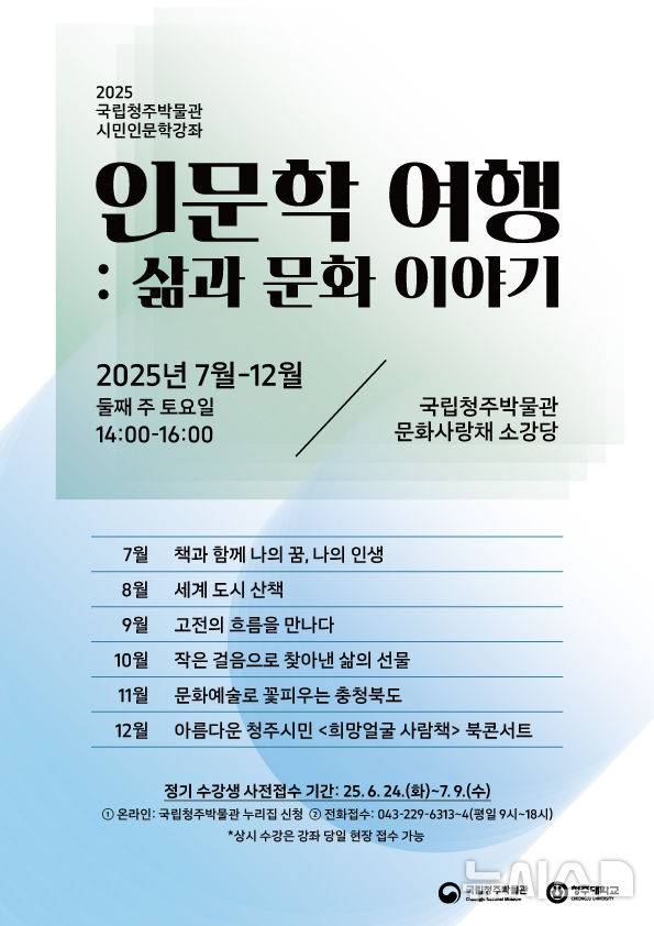 충북 국립청주박물관은 오는 24일부터 2025년 하반기 시민인문학강좌 '인문학 여행' 정기 수강생을 선착순 80명 모집한다고 21일 밝혔다.