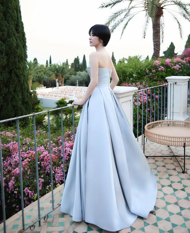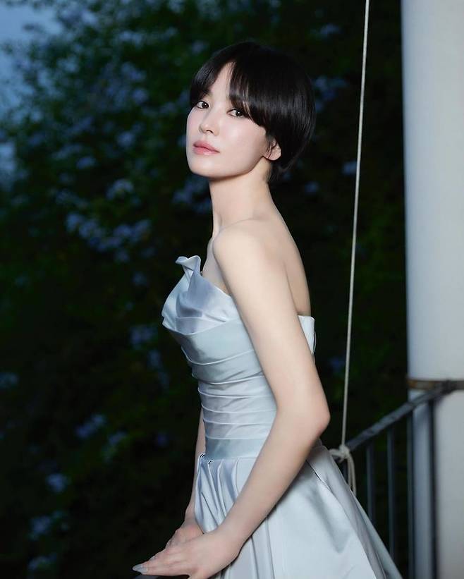 이날 송혜교는 파스텔 블루 톤의 스트랩리스 볼륨 드레스를 선택했으며, 에메랄드와 다이아몬드가 세팅된 쇼메의 리프(Leaf) 라인 하이주얼리 네크리스를 착용해 눈길을 끌었다.