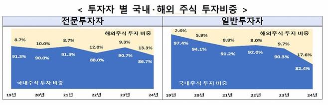 전문투자자는 해외주식보다 국내주식에 꾸준히 투자하는 경향을 나타냈다. 지난해말 전문투자자의 주식 투자금액 중 해외주식 비중은 13.3%로 2019년말 8.7% 대비 4.6%포인트(p) 상승에 그쳤다. 반면 일반투자자는 지난해말 17.6%로 2019년 2.6% 대비 15.0%p 상승했다.