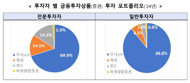 22일 금융감독원이 개인 전문투자자 현황과 이들의 포트폴리오를 분석한 자료에 따르면 지난해 말 기준 개인 전문투자자들의 주식·상장지수펀드(ETF) 투자 비중은 69.9%였다.