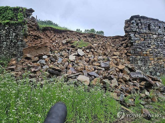 (고창=연합뉴스) 폭우가 내린 지난 21일, 전북 고창군 고창읍에 위치한 사적 145호 고창읍성 서문 옹성 3∼4m가량이 무너져 내린 모습. 2025.6.22 [고창군청 제공. 재판매 및 DB 금지]