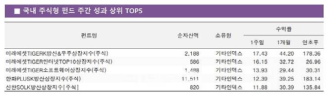 25일 펀드평가사 KG제로인에 따르면 순자산액(클래스 합산) 100억원 이상, 운용 기간 1개월 이상인 국내 주식형 펀드의 최근 일주일(16~20일) 수익률을 분석한 결과, '미래에셋 TIGER K방산&우주 ETF'가 17.43%로 가장 높았다.