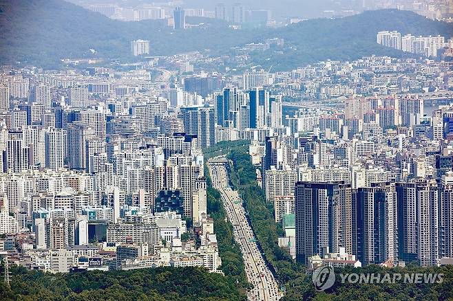 (성남=연합뉴스) 신현우 기자 = 지난 1∼4월 서울 아파트 시장에서 '강남3구'(강남·서초·송파)의 신고가 경신 거래가 '노도강'(노원·도봉·강북)의 약 25배에 달하는 것으로 나타난 가운데 22일 경기도 성남시 청계산 매바위에서 바라본 서울 경부고속도로 인근 아파트 단지.