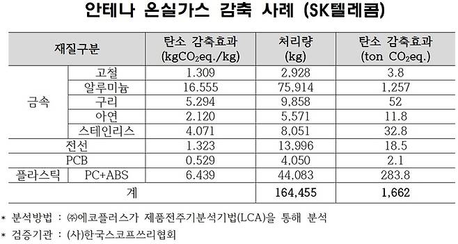 SK텔레콤이 한 해 동안 전국 이동통신망에서 발생한 폐안테나 약 164톤을 재활용해 연간 1662톤에 달하는 온실가스 감축을 검증한 것으로 드러났다. 온실가스 감축 효과가 큰 알루미늄부터 고부가가치 광물을 품은 인쇄회로기판(PCB)에 이르기까지 원자재 소비를 절감한 덕분이다.
