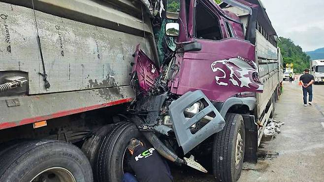 남해고속도로서 화물차 추돌사고…운전자 1명 중상·소 4마리 사망