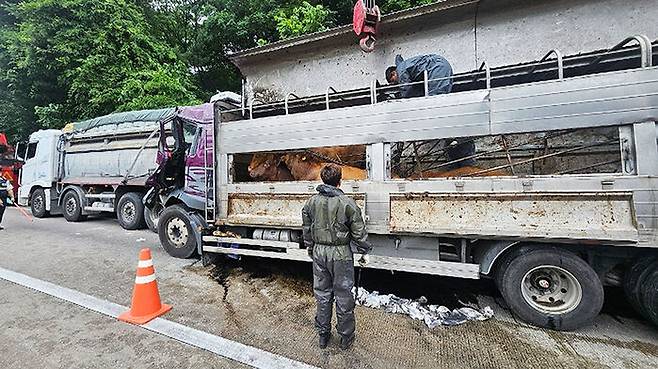 이 사고로 화물차 운전자 50대 A씨가 중상을 입고 병원으로 이송되고, 화물차에 실려 있던 소 10마리 중 4마리가 죽었습니다.