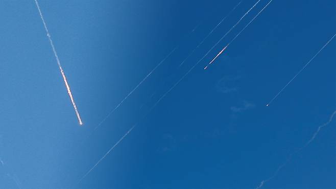 방송 진행자는 "지금 보고 있는 생중계 영상은 이스라엘을 향해 발사된 이란 미사일 일제 사격 장면"이라고 전하며, "소식통에 따르면 이란에서 이스라엘로 30발의 미사일이 발사됐다"고 밝혔습니다.